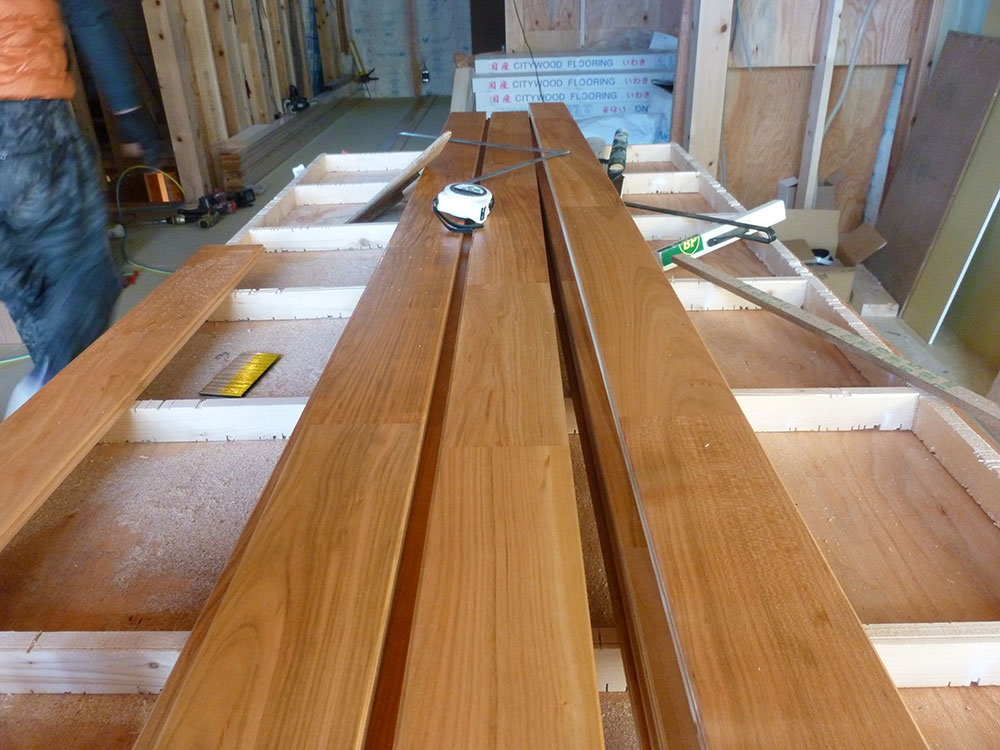 現在建設中の注文住宅にて、近年では、大変貴重な国産山桜の無垢の床材を採用いただきました。
