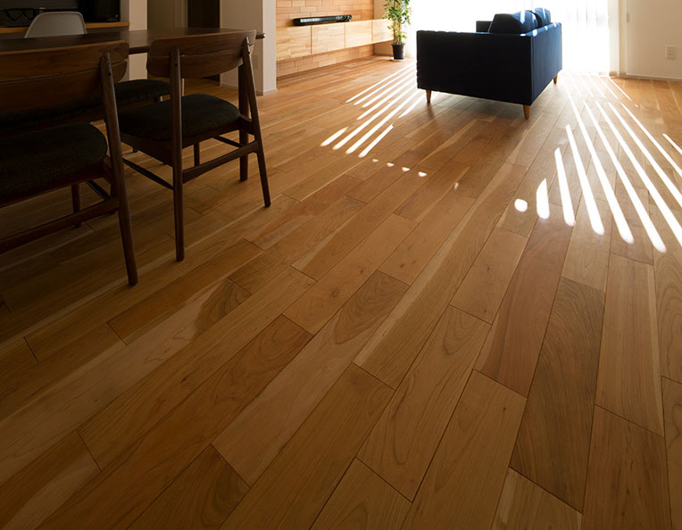 ヤマザクラの床材は、感触はソフトであたたかみがあり、年数がたつと上品な
