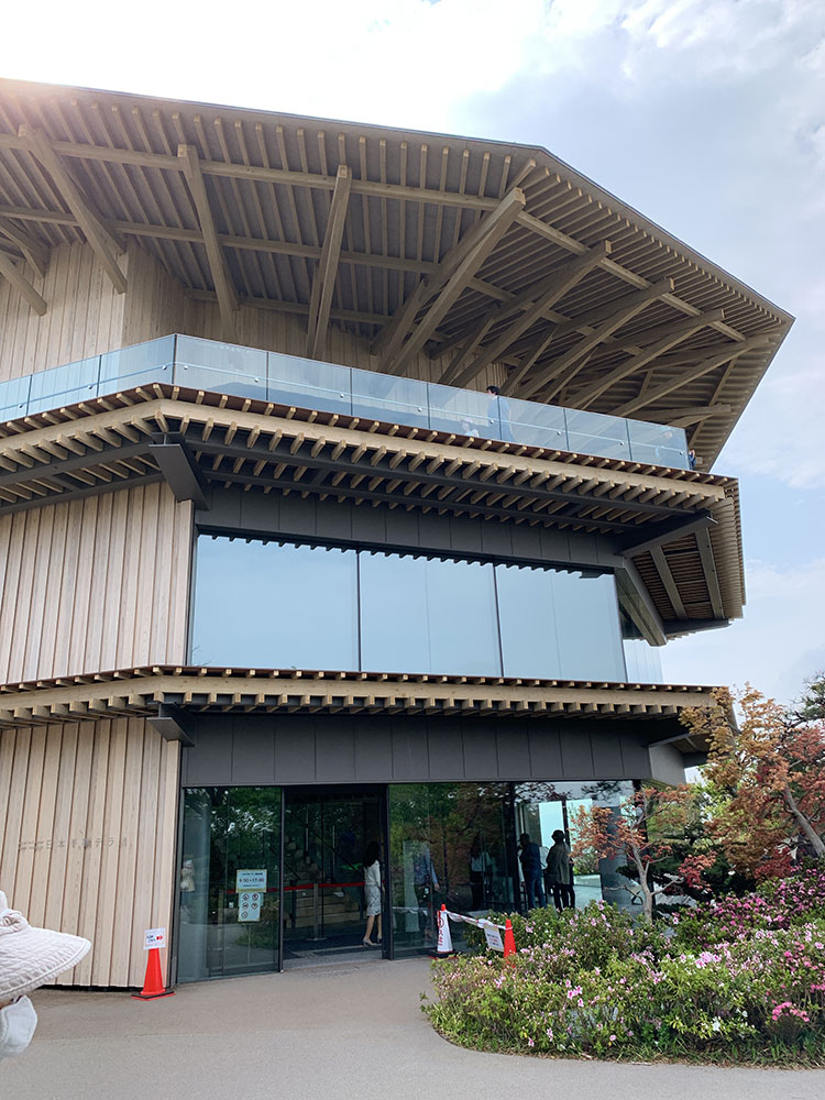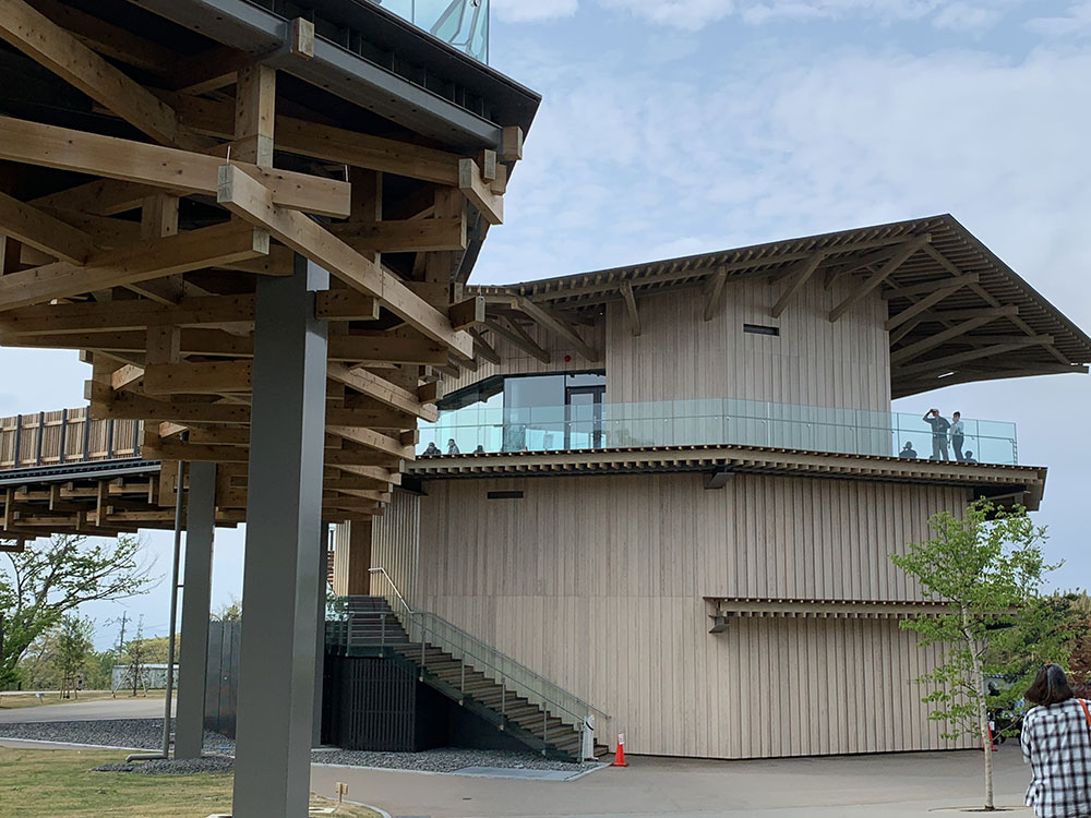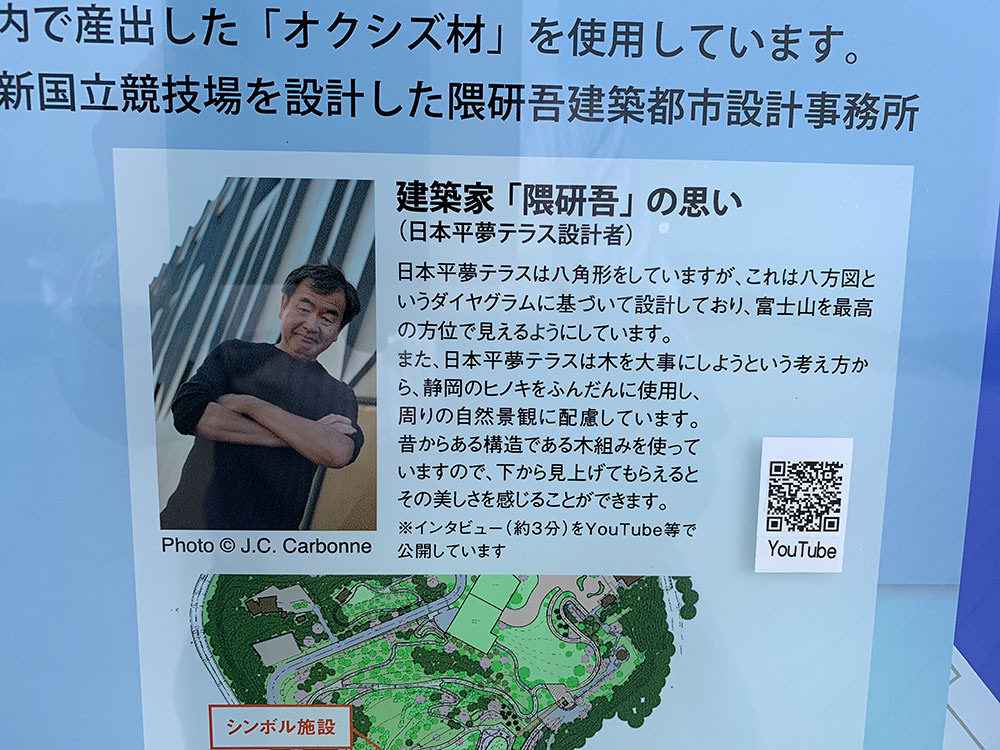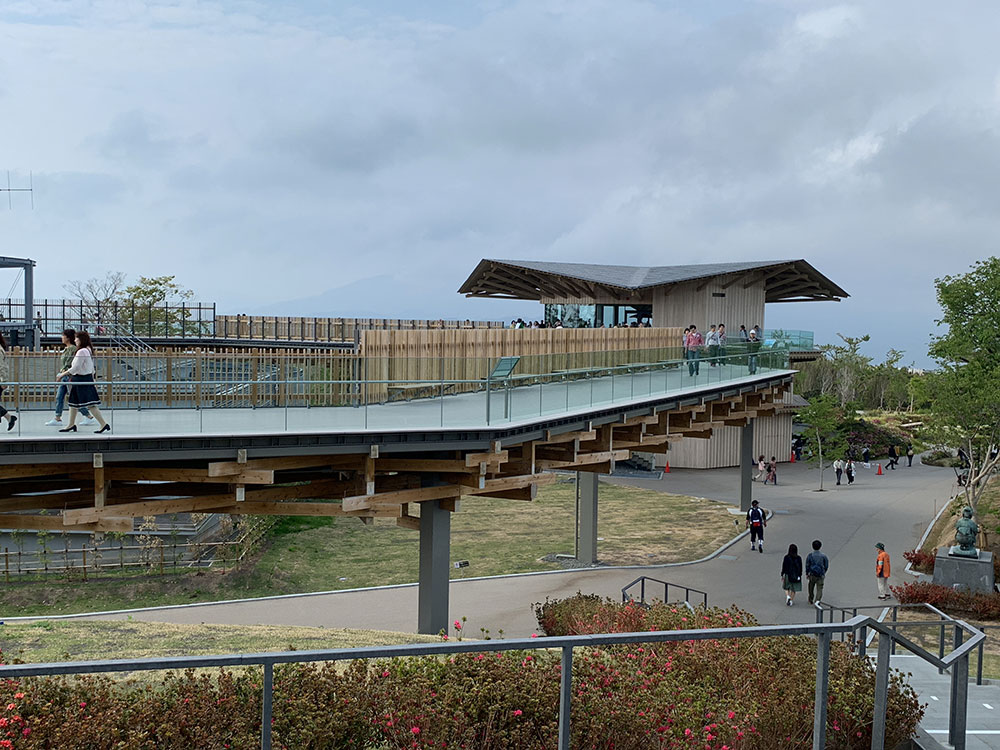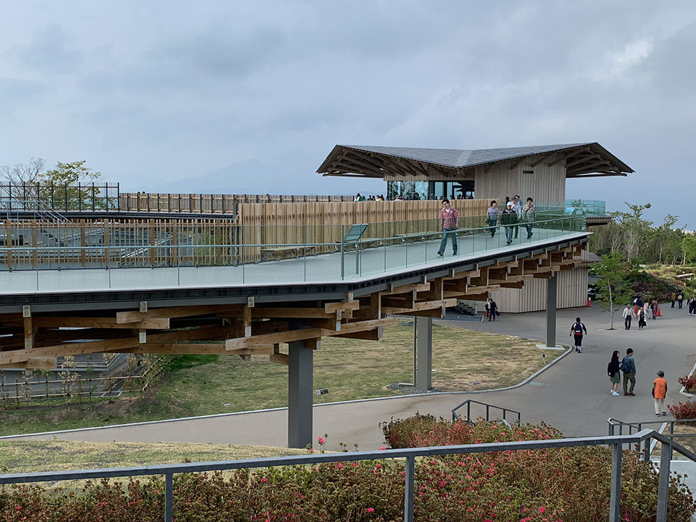 そこに 隈 研吾先生が 木造で回廊と展望施設の建物をつくられました。 静岡の桧をふんだんに使って、周りの自然景観に配慮したものになっていると